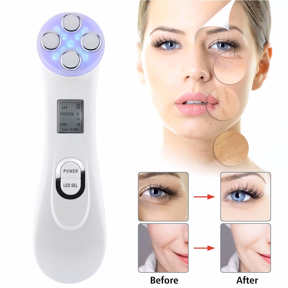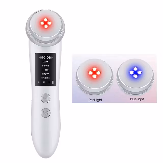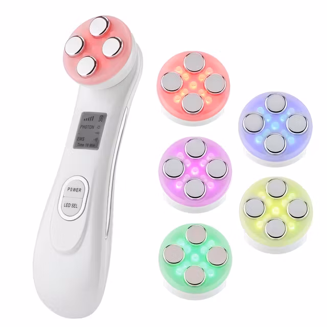Denna innovativa ansiktsvårdsenhet kombinerar fem effektiva ljusbehandlingar och EMS-mikroström för att ge dig en fullständig huduppgradering. Med röd, blå, grön och gul ljusbehandling, samt IPL-ljus, kan du bekämpa rynkor, förbättra hudtonen, och reducera akne, allt i en och samma enhet.