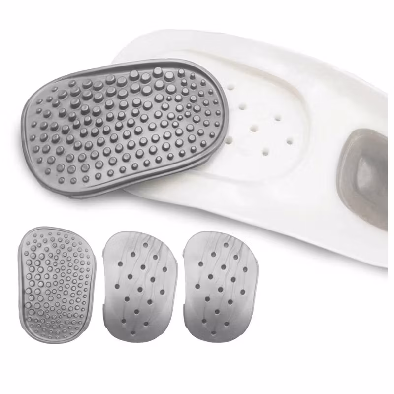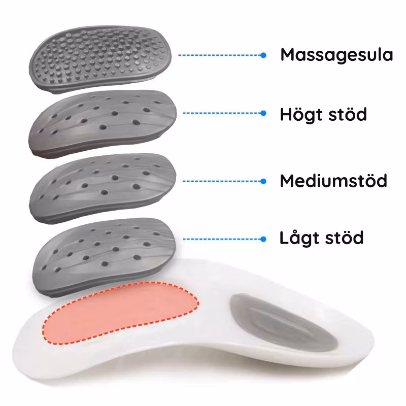 Genom att använda dessa smarta ihåliga fotstöd får du en korrekt fotreduktion och minskar smärta under fötterna, i knäna eller i höfterna. Paketet innehåller fyra olika utbytbara stödplattor.
