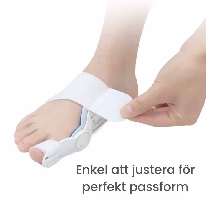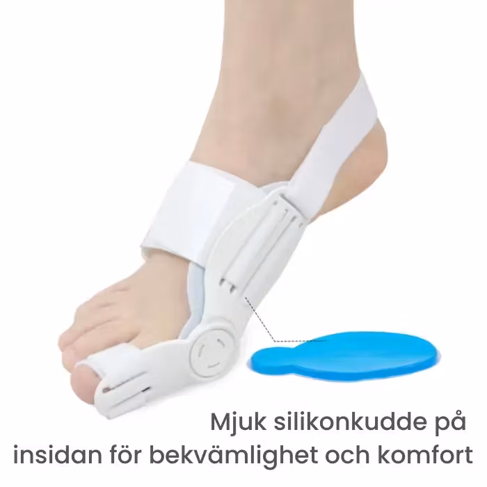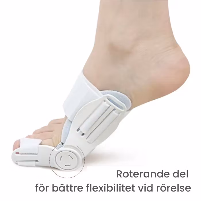 Vår mest avancerade stödskena med roterande del vid stortån för hallux valgus. Den korrigerande stödskenan har en mjuk silikonkudde mot tuberkeln för att avlasta trycket från skenan och göra stödet så bekvämt som möjligt. Den roterande delen ger bra flexibilitet när du går utan att kompromissa med det korrigerande stödet som ger foten en omedelbar behaglig avlastning. De justerbara kardborrebanden låter dig bestämma hur tight du vill att stödskenan ska vara. Den är bekväm att bära barfota och även på natten.