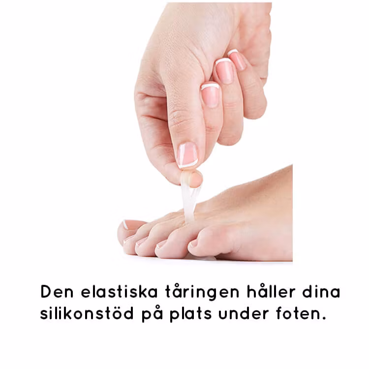 Genom att fästa stödet under foten tvingar du tårna till en korrekt position vilket minskar trycket på tåspetsen. Gelkuddarna är tillverkade av 100% TPE-gummi och tack vare sitt mjuka, flexibla och slitstarka material ger de en smärtlindrande effekt med hög komfort.