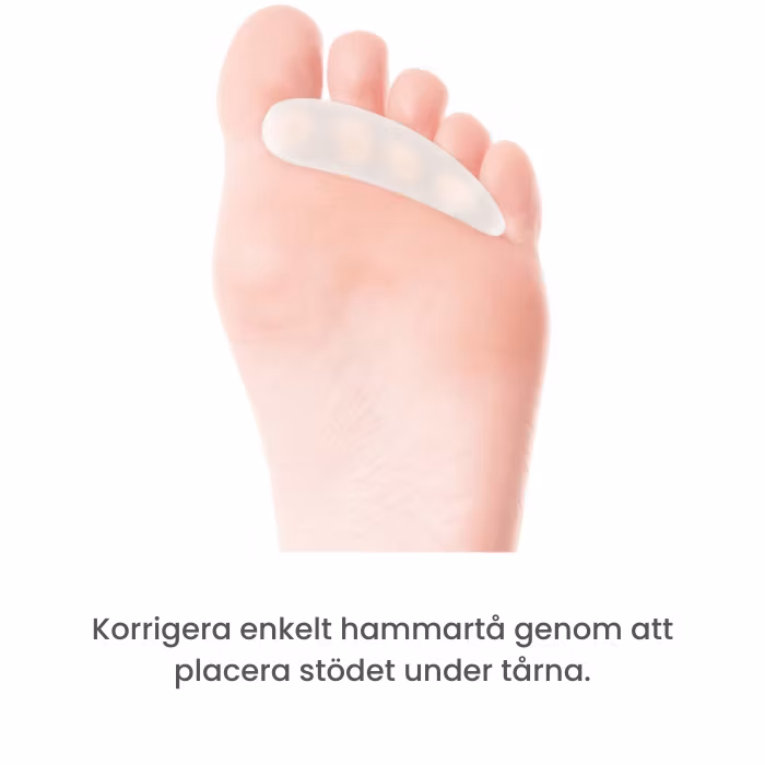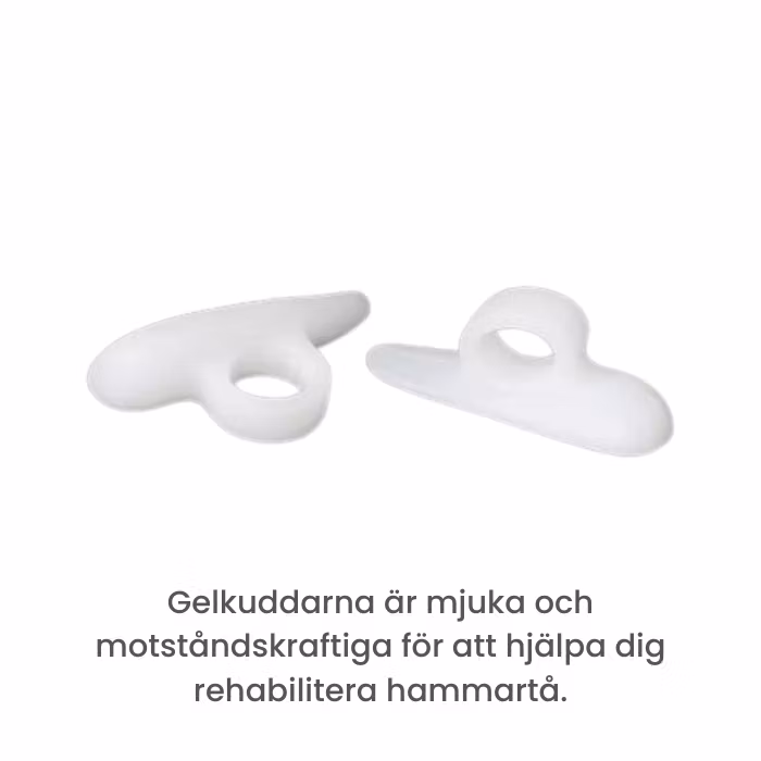 Gelkuddarna skyddar dina tår från skav och blåsor vid besvär med hammartå. Hammartå uppstår när den mittersta tåleden böjs uppåt och tån tar en hammare liknande position. Ett par orsaker till hammartå kan va för trånga skor eller Hallux Vaxus men även medfött.