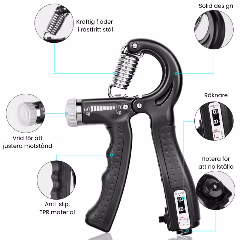 Förbättra din styrka och uthållighet med vår justerbara handgreppstränare. Med möjligheten att justera vikten mellan 10 och 60 kg, kan du anpassa din träning efter dina specifika behov och mål. Tränaren är utformad för att ge en utmanande träning för dina händer, underarmar och fingrar, och är en viktig del i förbättringen av din styrka och prestanda.