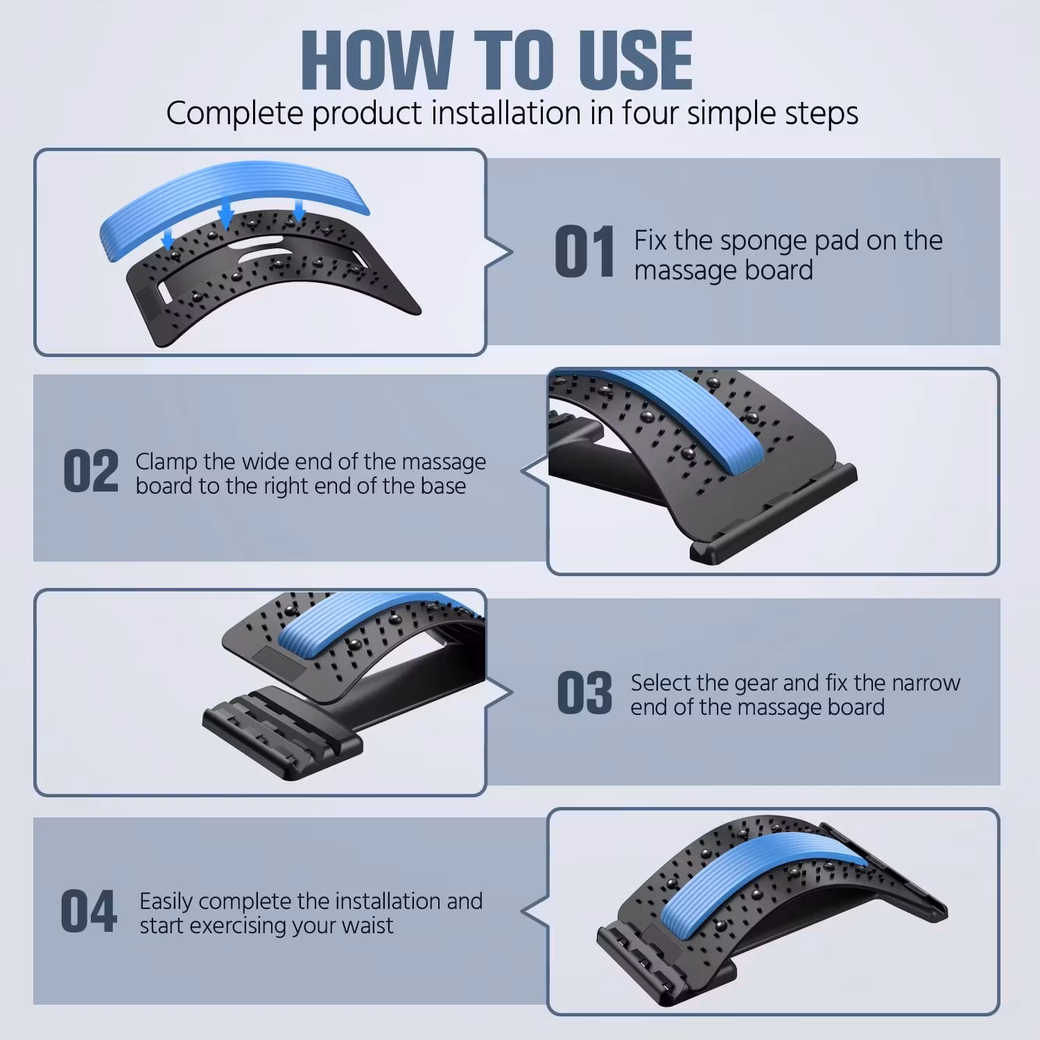 Denna justerbara ryggsträckare är utformad för att lindra spänningar, förbättra hållning och minska smärta i både övre och nedre delen av ryggen. Perfekt för dig med diskbråck, stelhet, ryggvärk eller stillasittande livsstil.