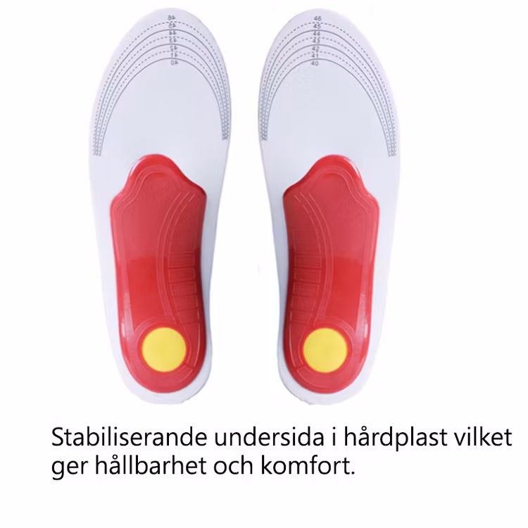 Skoinläggen har en medgörlig höjning vid hålfoten som är designad för att bromsa pronation i fotleden vilket ger ökad stabilitet och minskar belastningen på foten. Inläggen fungerar utmärkt till vardagsskor såväl som arbetsskor.