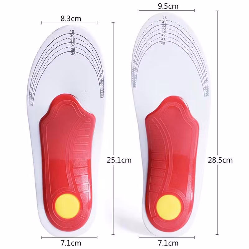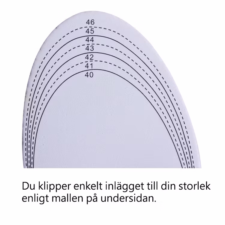 Skoinläggen finns tillgängliga i två olika storlekar, liten eller stor. För att skoinläggen skall passa just dig mäter du foten mot mallen på inläggets undersida och klipper med en sax så att det passar.