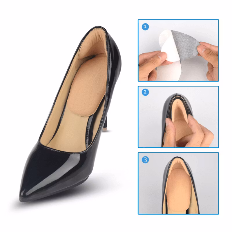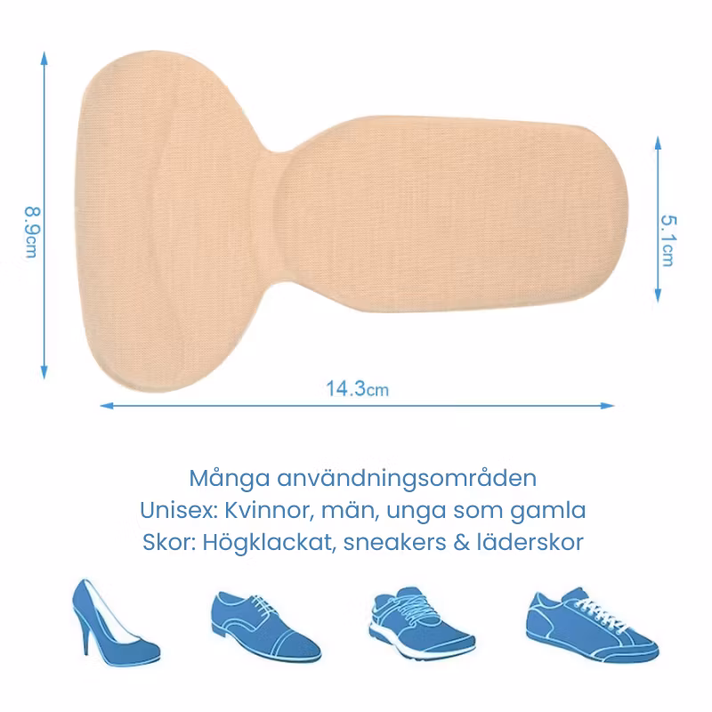 Inläggen är självhäftande och kan enkelt fästas på hälen i skorna. De kan också lätt tas bort eller flyttas till andra skor utan att skada skon. Inläggen skyddar hälen och ger komfort. Skoskaven kommer att vara så gott som borta.