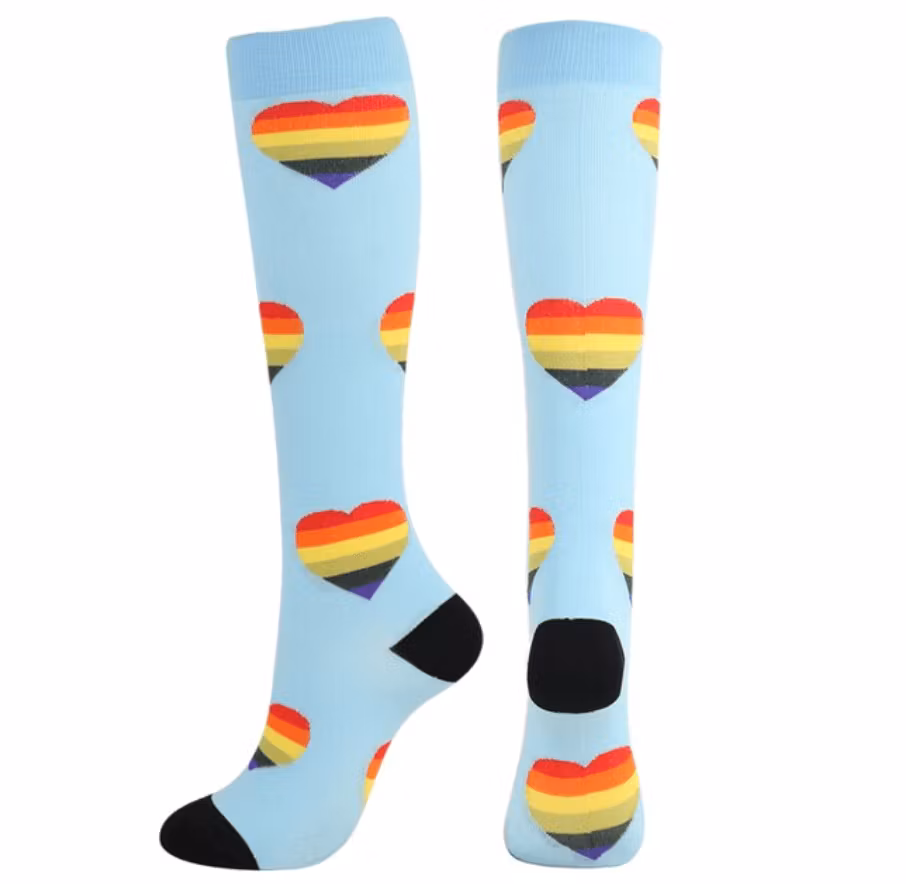 Ett par ljusblå härliga stödstrumpor i färgglatt mönster med hjärtsymboler. Stödstrumpor ger kompression för benen vilket ökar blodcirkulationen. Detta minskar i sin tur svullnad och trötthet i benen. Stödstrumpor fungerar som ett utmärkt hjälpmedel för den som belastar benen mycket under dagen.