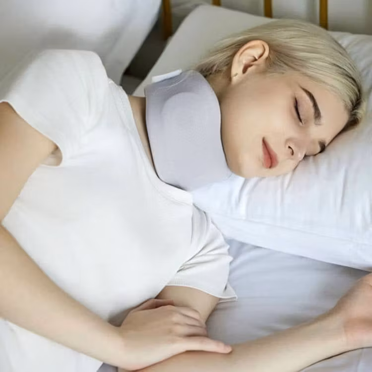 NeckNest Neck Brace hjälper till genom att hålla nacken rak. Den trycker försiktigt in nacken i en bra position så att luften kan flöda bättre och hindrar halsen från att göra dessa snarkljud. Det hjälper också till med sömnapné, vilket är när du slutar andas under korta stunder under sömnen.