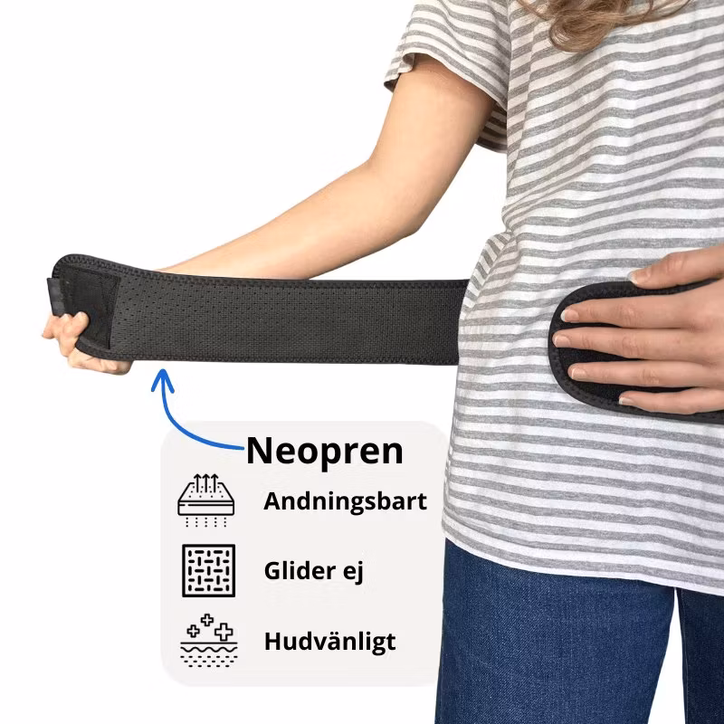 Bältet är tillverkat av slitstarkt neoprenmaterial och till skillnad från många andra lösningar dras det åt över höfterna, så att det inte känns obekvämt i någon position.